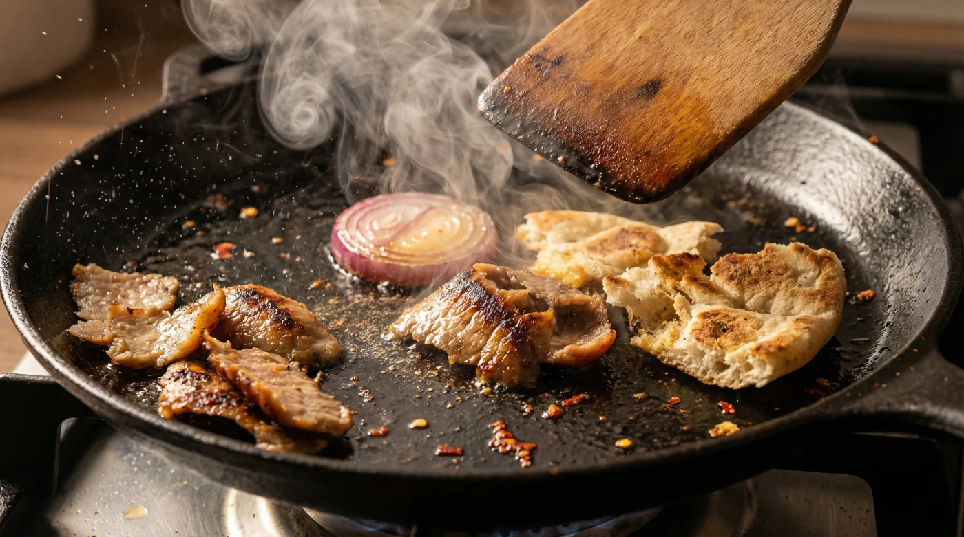 Das taktische Toolkit erfordert keine Sonderausstattung. Eine schwere Gusseisenpfanne oder eine gute Beschichtung reicht aus. Die Temperatur bleibt anfangs hoch (etwa 200 Celsius für das Fleisch) und sinkt dann für das Brot auf mittlere Hitze ab, damit es nicht verbrennt, sondern sanft durchtrocknet. Nutze einen Pfannenwender aus Holz oder hitzebeständigem Silikon, um das Brot beim Braten sanft nach unten zu drücken – fast so, als würdest du ein Kissen atmen lassen. Dieser leichte Druck sorgt für eine gleichmäßige Bräunung der Oberfläche.